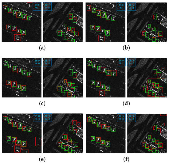 The detection results reported in Table 1. The red boxes represent the detection results and the green boxes represent the ground truth. We count the evaluation results in blue boxes. TP means accurately detected targets and FA means false alarms. (a) Faster R-CNN [16]. (b) Cascade R-CNN [17]. (c) SSD [15]. (d) RetinaNet [39]. (e) Yolov3 [14]. (f) LDM.