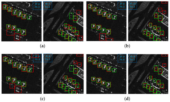 The detection results reported in Table 4. The red boxes represent the detection results and the green boxes represent the ground truth. We count the evaluation results in blue boxes. TP means accurately predicted targets and FA means false alarms. (a) +Dens [32]. (b) +RB. (c) +LDM(+Dens). (d) LDM.
