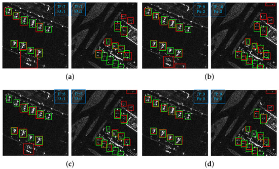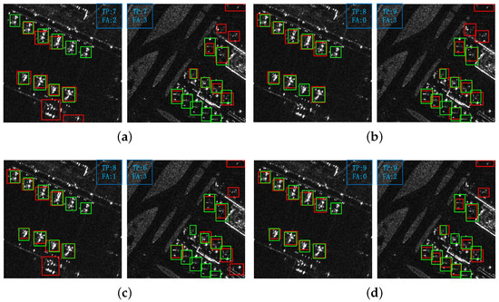 The detection results reported in Table 5. The red boxes represent the detection results and the green boxes represent the ground truth. We count the evaluation results in blue boxes. TP means accurately predicted targets and FA means false alarms. (a) +SE [34]. (b) +CBAM [30]. (c) +ECA [35]. (d) LDM.