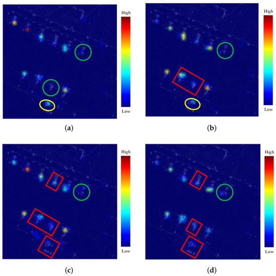 These visualizations give an intuitive impression of the detection results of each module. As shown in Figure 14, we visualized the detail detection probabilities with fine configurations in different modules. Then, we applied the color map according to probability values, and lay it on the detection image. As shown in Figure 14b, the RB module obviously increases the confidence in red boxes. For two missing targets in Figure 14a, there is some improvement in the weak aircraft features in red boxes. However, one instance was still missed (in the green circle) because reusing features does not generate new information. As shown in Figure 14c, the ICB module accurately increases detection confidence by amplifying salient points. The probability of false positives is reduced by decreasing those element values to suppress background interference. As shown in Figure 14d, LDM still missed one instance due to a lack of aircraft features. However, it successfully removed the false alarm because the reasonable combination of the RB modules and ICB modules suppresses redundant information and background interference. From these visualizations, we can observe that the RB module has an excellent ability to reuse information, and the ICB module effectively enhances aircraft features and suppresses background interference, both of which strongly demonstrate the effectiveness of the proposed modules.