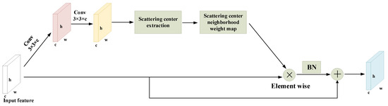 The ICB module can effectively enhance the scattering characteristics and suppress background interference, but it can be further improved. We use a quadratic function to generate SGID. This is a simple and effective method. The scale function can be replaced by other template operators, which may generate more accurate weight maps. Besides, we took some inspiration from [41], which demonstrates a deep learning approach and a model based approach (using scattering centers) for classification, and also provides various fusion techniques. In [41], Theagarajan et al. use segmentation and local maxima to extract the scattering centers. Due to its simple and practical operation, it is a worthwhile attempt to use this algorithm in deep learning. For a combination of a method in [41] and the ICB module, a feasible structure is shown in Figure 15. Scattering center extraction employs segmentation and local maxima to seek more potential scattering centers of targets. Then, it notes the scattering center position and enhances the pixels in the neighborhood based on the distance.