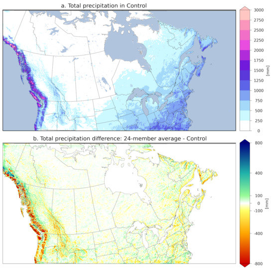 Figure 2 shows the accumulated precipitation (in mm) over the full study period (September 2018–June 2019) in the control member (top panel) and its difference with the mean of the 24 CaLDAS members (bottom panel). As seen on the figure, the result of the perturbation process is an overall large negative precipitation bias over mountainous regions, with an underestimation of up to 40% over certain areas, leading to insufficient snow accumulation at higher elevations. This limitation in the perturbation method of precipitation fields only affects mountainous areas, which are mostly the Mackenzie and Rocky mountains and the Pacific Coast ranges in the western part of the study domain, as well as the Appalachian mountains in the eastern part of the domain. The slight differences seen in