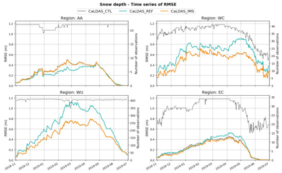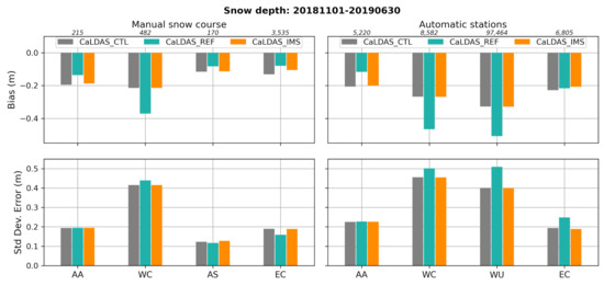 In arctic regions such as the Alaska-Arctic region (AA), a degradation in bias and RMSE is observed when in situ data are not assimilated (i.e., in CaLDAS_CTL and CaLDAS_IMS). In these regions in CaLDAS_IMS, the assimilation methodology causes the snow analysis to be strongly dependent on the quality of precipitation forcings and the snow model during winter when both observations and model show snow on the ground, and no data are assimilated. The snowpack scheme in SVS [