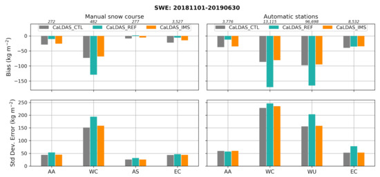 10] are also contributing. The largest values in bias and STDE can be found in the mountainous regions of Western Canada and Western USA for all three simulations. Nonetheless, CaLDAS_IMS significantly reduces these errors compared to CaLDAS_REF and slightly reduces them compared to CaLDAS_CTL. These two subregions are mostly covered mountainous areas, but also encompass non-mountainous areas where IMS data assimilation can occur, thus explaining the advantage of CaLDAS_IMS compared to CaLDAS_CTL.