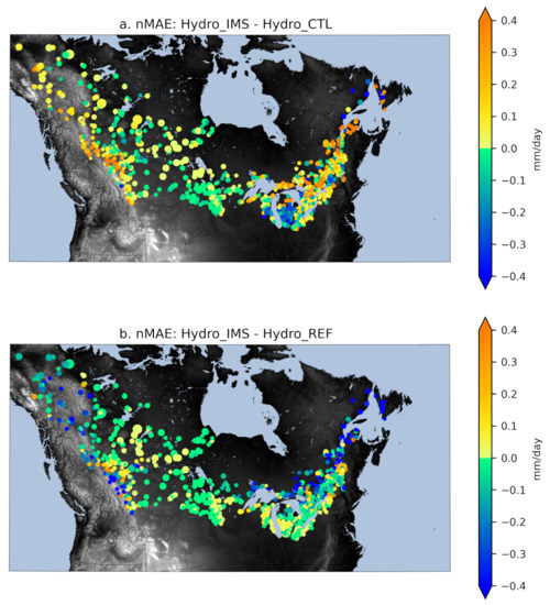 Figure 10) shows that even though all simulations lack water due in part to the precipitation deficit, the enhanced water conservation in CaLDAS_IMS greatly improves streamflow simulations when Hydro_IMS is compared to Hydro_REF, and only slightly degrades the results when compared to Hydro_CTL. A similar result is obtained throughout the study domain with an increase in average MAE of 5.4% compared to Hydro_CTL but a larger reduction of 6.7% compared to Hydro_REF, with the largest improvements along the mountains in the western part of the domain and along St Lawrence river.