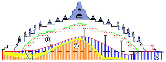 The foundation of the temple is a hill that is artificially built with stones carried from surrounding volcanoes on three smaller naturally formed hills. As shown in Figure 5, the layers from A to C are naturally formed, and layer D is artificially built. Based on the result of the UNESCO boring survey, the naturally formed hills can be divided into three layers by soil types: from bottom to top: soft volcanic tuff, foam with andesite, and andesite. The Borobudur temple can be imagined as a huge stone sculpture built around the surface of the foundation without entries or an internal space. Therefore, the foundation is not available for the scanning methods, and the only information remaining is the CAD drawing based on the boring survey. The CAD drawing was created based on a boring survey conducted by UNESCO in 1968. It is archived as an AutoCAD-format file (see Figure 5).