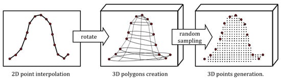- STEP 3: The final step is to generate 3D points from the 3D polygon data of Step 2. Generating points directly from 3D polygon data will lead to a huge calculation cost, thus it is necessary to split the 3D polygon into an amount of 2D triangles. For a polygon with n vertex points, by connecting each vertex point to any two other points, sub-triangles are created. Then sampling points can be randomly generated from each triangle based on the coordinates of its three vertex points. The number of the points generated from each triangle is fixed to make the output points have a uniform distribution.