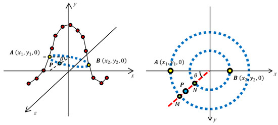 For each sampling point P, the is defined as the angle between the x-axis and the line formed by origin and P. By defining the distance between the rotation track of A and B as 1, t is the distance between point P to the rotation track of A (see Figure 8). The equation to calculate the coordinate of P is as follows: