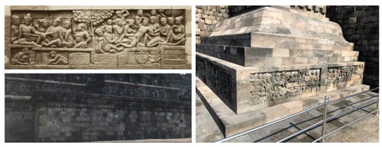 The Borobudur temple is one of the UNESCO World Heritage sites and is known as the largest Buddhist temple ruin in the world (see Figure 1). The temple is a stupa built with stones extracted from the volcanic rocks outcropping nearby. It is built on a hill that serves as the foundation of the temple. The hill is artificially built from three smaller naturally formed hills. According to the results of the UNESCO boring survey, the hill is divided into four layers based on soil qualities [18]. This four-layer foundation forms the internal structure of the temple. For the external structure, the temple building consists of nine stacked platforms, six square and three circular, topped by a central dome [19]. On the stone walls of the six square platforms, 2672 panels of bas-reliefs (sculptural reliefs in which forms extend only slightly from the background), containing 1460 narrative panels and 1212 decorative panels, are carved. These reliefs can be divided into five sections, each of which describes a different Buddhism story. Unfortunately, due to safety concerns, the foot encasement of the temple was reinstalled, and the section carved on the foot encasement named “Karmawibhangga” was buried behind the stone walls. This section has 160 relief panels, and only four panels at the southeast corner are visible to visitors. The remaining 156 relief panels are hidden by the stone walls. According to the abovementioned situation, the Borobudur temple can be divided into three parts, as shown in Figure 2: (1) the temple building, (2) the foundation, and (3) the hidden reliefs.