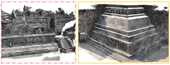 The close-range photogrammetry results of these two parts (images on the right of Figure 11) are shown in Figure 12. The left image of Figure 12 shows the digitization result of the southern parts near the stairs on the first level that corresponds to the top-right image in Figure 11. The right image of Figure 12 shows the digitization result of the southeast corner of the temple, on which the remaining four panels of the Kamavibangga reliefs are carved, that corresponds to the top-right image in Figure 11. Both datasets contain over points. The Buddha statues, the Buddhist reliefs, and the decorations on the corridors can be seen clearly, owing to the high quality of the photos provided by the close-range photogrammetry.