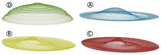In this section, we present the reconstructed 3D model of the foundation of the Borobudur temple. The foundation consists of four layers, as shown in Figure 5, and each layer is converted into a point dataset based on the rotating extrapolation described in Section 3.3. Figure 14 shows the reconstructed points of each layer and the number of points of each layer is summarized in Table 1. The results achieved smooth curved surfaces describing the shape of each layer. Because the available CAD drawing is only for one direction of the temple, the reconstructed 3D shapes of the asymmetric layers are not entirely accurate. However, the reconstructed layers by the proposed method are still advantageous for understanding the structure of the Borobudur foundation.