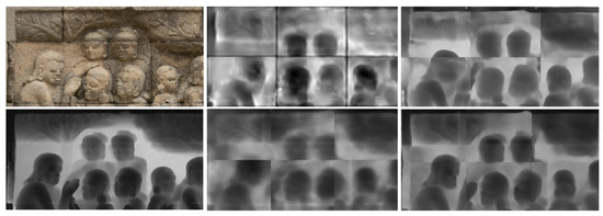 In this section, we present the reconstructed 3D model of the reliefs in the Borobudur temple obtained by the proposed deep learning-based method. As the hidden reliefs are buried by the stones with only monocular photos remaining, the ground truth of the hidden reliefs is not available for quantitative or qualitative comparison. Thus, we chose one visible Karmawibhangga relief as test data to evaluate the proposed method. The qualitative comparison results are shown in Figure 16. The proposed method is compared with three models, a multiscale CNN-based model [21], a ResNet-based model [22], and a DenseNet-based model [42].
