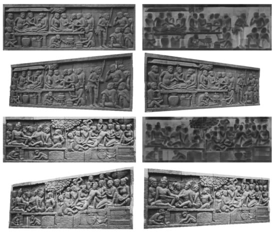 The Buddhist reliefs carved on the walls of the six square platforms of the Borobudur temple are the largest collection in the world. They are sculptural reliefs in which forms extend only slightly from the background. These reliefs can be divided into five sections, each of which describes a different Buddhism story. Unfortunately, one section named “Karmawibhangga” was buried behind the stone walls after the reinstallment of the foot encasement due to safety concerns. This section has 160 relief panels, and only four panels at the southeast corner are visible to visitors. For each hidden panel, there remains one grayscale photo taken directly in front of the reliefs in 1890. Figure 9 shows an example of the old photo (left top), the stone wall covering the hidden reliefs (left bottom), and the southeast corner with the remaining four “Karmawibhangga” reliefs (right).