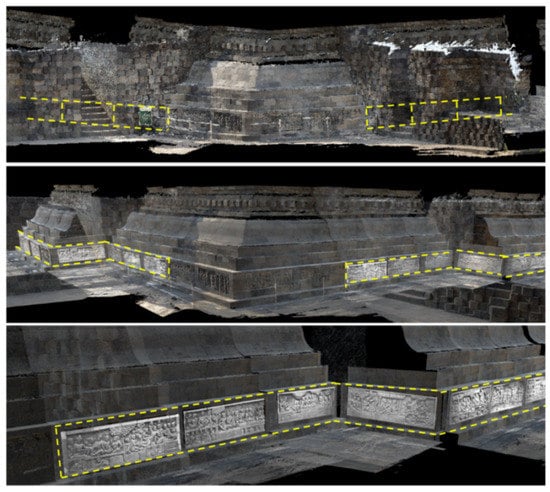 Recently, the three-dimensional (3D) recording of cultural heritage (CH) has attracted enormous interest worldwide [1]. The complete 3D recording process of CH usually contains five steps: 3D digitization, 3D data processing, archiving, visualization, and reproduction [2,3,4]. The steps up to archiving address the problem of permanent preservation of CH. Visualization is an important way to analyze CH, and reproduction involves virtual representation, application, post-disaster reconstruction, etc. In this study, we focus on the 3D digitization and visualization of large-scale CH assets and use the Borobudur temple in Indonesia, a UNESCO World Heritage site, as our experimental subject.