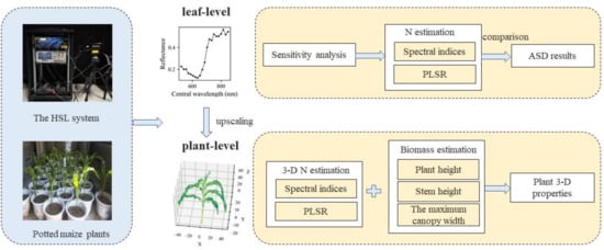 The workflow of this study is illustrated in Figure 1. Using a prototype HSL device developed by our research community [], this study estimated the maize N concentration from the 2D leaf level to the 3D plant level.