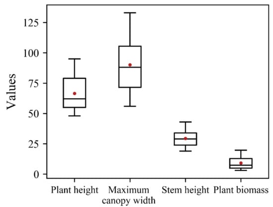 Box plots of the measured values of plant height, maximum canopy width, stem height, and plant biomass. The unit of plant height, maximum canopy width, and stem height was cm, and the unit of plant biomass was g.