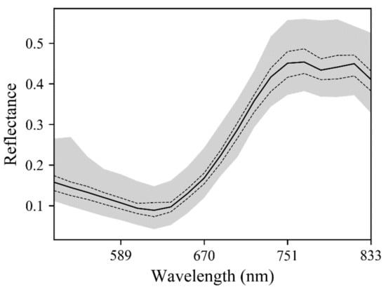 Spectra collected with 2D maize leaves were used to analyze the reflectance characteristics of HSL data. The medium value, variation range, and the first and third quartile of each wavelength band are shown (Figure 4). The reflectance curve—consisting of 20 HSL wavelength bands—was relatively smooth, with the inner wavelength bands, had a higher signal-to-noise ratio. There was an increasing trend in the red edge region (670–760 nm), which was known to be sensitive to multiple plant properties (e.g., chlorophyll, nitrogen, and carotenoids).