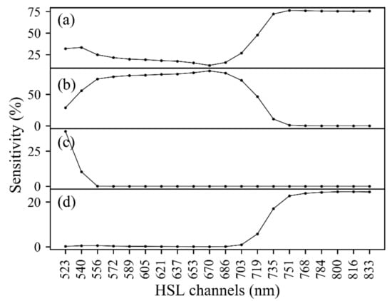 Sensitivity analysis of the (a) plant structure parameter (N), (b) total amount of chlorophyll a and chlorophyll b (Cab), (c) carotenoid (Car), and (d) leaf mass per area (LMA) in terms of the reflectance of HSL wavelength bands. The dataset was obtained by simulating the PROSPECT-5 model.
