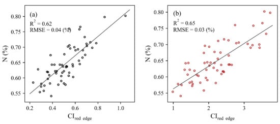 Relationships between the measured and estimated N concentration at the plant-level. The estimated values were obtained using (a) CIred edge and (b) PLSR.
