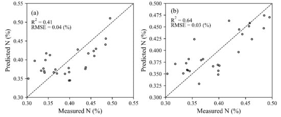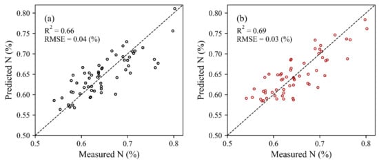With ten spectral indices as inputs, the PLSR model exhibited a good ability to estimate the N concentration, since the data points were closer to the 1:1 line (Figure 7). The fitness between the measured and estimated values of PLSR was better than that obtained using spectral indices, with the estimation accuracy of ASD (R2 = 0.70, RMSE = 0.03%) being higher than that of HSL (R2 = 0.66, RMSE = 0.04%).
