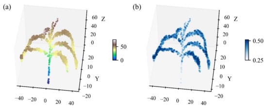 (a) Elevation distribution (cm) and (b) N concentration (%) distribution of 3D maize plants. The unit of X, Y, and Z is centimeters.