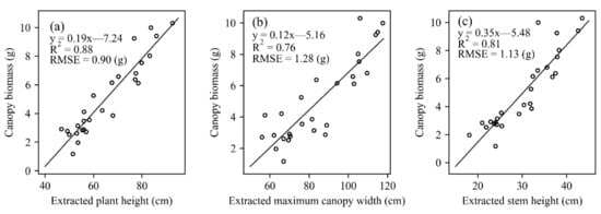 Relationships between plant biomass and the extracted structural proxies of (a) plant height, (b) maximum canopy width, and (c) stem height.
