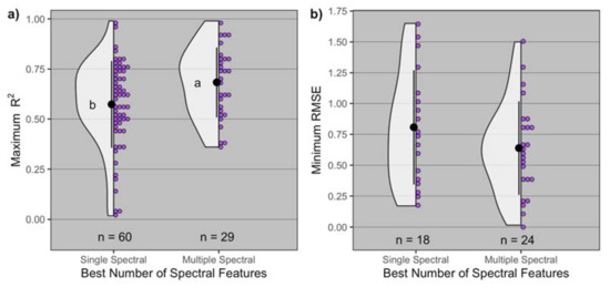Distribution of (a) maximum R2 and (b) minimum root mean squared error (RMSE) by type of the best spectral covariable (single and multiple spectral). Black dot and lines represent the mean ± standard deviation, and n is the number of observations for each best number of spectral features. In panel (a), means followed by the same letter are not significantly different at α = 0.05.