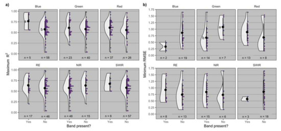 Distribution of (a) maximum R2 and (b) minimum root mean squared error (RMSE) by presence or absence of different bands (blue, green, red, RE = red-edge, NIR = near infrared, SWIR = short wave infrared) in the spectral feature utilized to model grain protein concentration. Black dot and lines represent the mean ± standard deviation, and n is the number of observations for each distribution. Means followed by the same letter are not significantly different at α = 0.05.