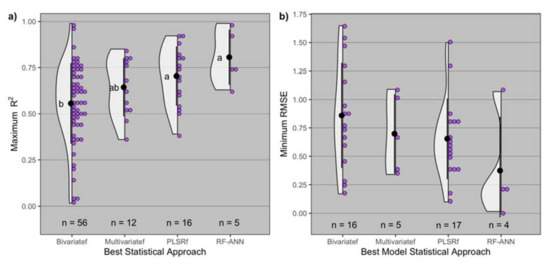 Distribution of (a) maximum R2 and (b) minimum root mean squared error (RMSE) by statistical approach (bivariatef = bivariate family, multivariatef = multivariate family, PLSRf = partial least squares family, RF-ANN = random forest artificial neural network) utilized to model grain protein concentration. Black dot and lines represent the mean ± standard deviation, and n is the number of observations for each distribution of best statistical approach. Means followed by the same letter are not significantly different at α = 0.05.