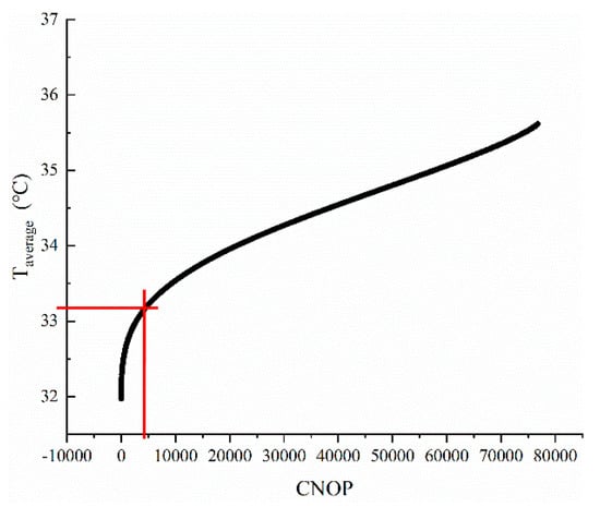 The curve of the average temperature (Taverage) with the cumulative number of pixels (CNOP) in a TIR image. The red line represents the boundary between the forest gap pixels and forest canopy pixels. The area within the red lines represents the change of Taverage with the CNOP in the forest gap. The area outside the red lines represents the change of Taverage with the CNOP in the forest canopy.