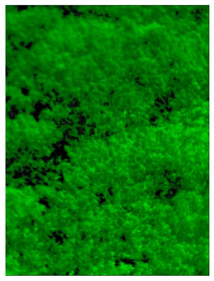 An image segmented using the Otsu algorithm (the green pixels represent the forest canopy; the black pixels represent the forest gap).