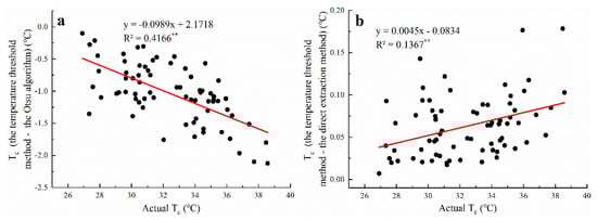 Comparisons between the Tc values obtained using the temperature threshold method, the Otsu algorithm, and the direct extraction method are provided in Figure 6. The difference between the Tc values obtained using the temperature threshold method and the Otsu algorithm was less than zero and decreased with increases in the actual temperature (Figure 6a). However, the difference between the Tc values obtained using the temperature threshold method and the direct extraction method was greater than zero and increased with increases in the actual temperature (Figure 6b). This result shows that, during the processing of the TIR images, the forest gap pixels were eliminated when using the temperature threshold method. In addition, no serious missing segmentation phenomenon was observed. Thus, the Tc values obtained using the temperature threshold method were closer to the actual Tc.