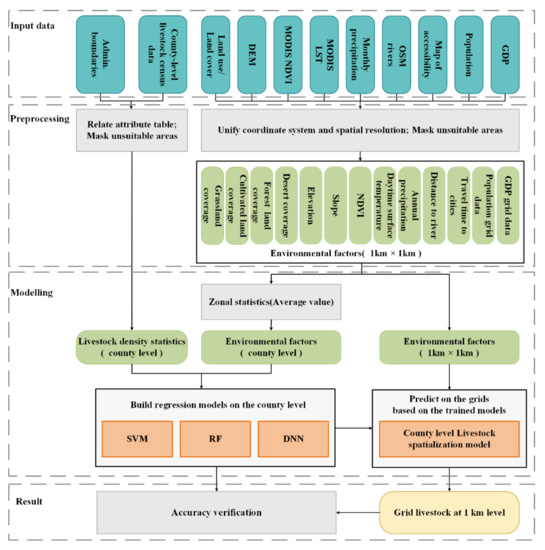 Firstly, the livestock census dataset and land cover, terrain, climate, and socioeconomic dataset were preprocessed, including suitability masking, unified coordinate system, and spatial resolution. Then, 13 environmental factors were extracted from the pre-processed land cover, topography, climate, and socioeconomic databases, with a spatial resolution of 1 km × 1 km. Perform regional statistics and average values to obtain the mean values of environmental factors in counties as independent variables for model construction. For the model dependent variable, we calculated the livestock density of each county, then converted it to log10(n + 1) values to normalize the distribution of the dependent variable. Based on the above independent variables and dependent variables, we obtained a total of 1226 samples (counties), of which 70% were used to train the model and 30% were used to verify the model’s accuracy. The SVM, RF, and DNN based regression models are constructed on the county scale. The basic hypothesis of this study is that there is a robust statistical relationship between livestock density and these environmental predictors at the county-level scale, which in turn could be used to disaggregate livestock census data spatially [11,12]. We apply the trained models to the grid level to obtain livestock density data with a spatial resolution of 1 km based on this assumption. To maintain better consistency between the number of livestock predicted by the developed machine learning models and the census data, we further fine-tuned the estimated results. Finally, the livestock density data were compared with all county-level livestock statistics data to verify the accuracy of the livestock spatialization. The overall process is shown in Figure 2.