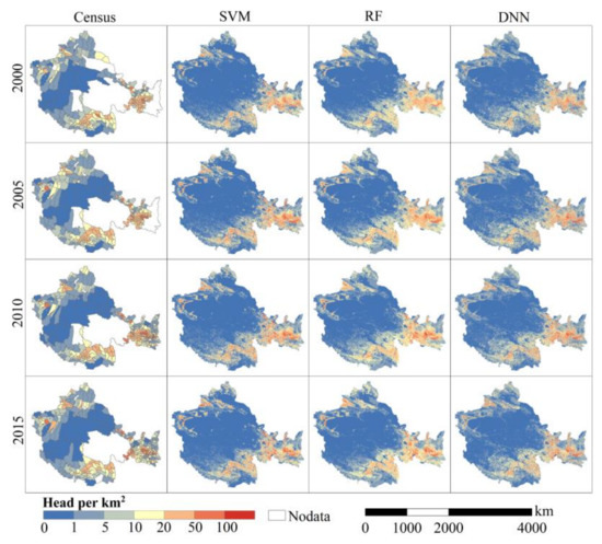 Figure 3 and Figure 4 show cattle and sheep distribution of western China estimated by the three machine models in 2000, 2005, 2010, and 2015. The overall trends of the cattle and sheep distribution derived by three livestock spatialization machine learning models are similar and generally consistent with the statistical data. Obviously, the mapping results give the detailed spatial distribution characteristics of livestock, which the census data cannot describe. The cattle are mainly concentrated in the southeast and northwest areas of the study area, showing two northeast-southwest distribution belts (Figure 3). The high cattle densities are found in central Shaanxi, southeastern Gansu, and the northern and southern ends of the Ningxia. Cattle are also dense in southeastern Qinghai, central to northeastern Tibet, and western Xinjiang. It can be seen from the spatial distribution of sheep in Figure 4 that the number of sheep in the study area significantly exceeds the number of cattle, which is consistent with the actual situation (i.e., census data). Figure 4 shows there are denser sheep in the east, northwest, and southwest part of the study area, while there are sparser sheep in the middle part. The northern Shaanxi, entire Ningxia, Hexi Corridor of Gansu Province, eastern Qinghai, and western Xinjiang have a dense sheep population. The sheep of Tibet are mainly compact in the central and southern regions. The regions where livestock gathers are mostly grassland and arable land resource-rich areas. These resources provide better natural conditions for the survival of livestock.