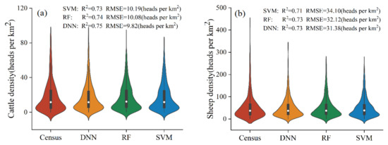 Table 2 summarizes R2 and RMSE of estimated distribution density of cattle and sheep for each machine learning based livestock spatialization model. In general, the errors of the three models are within acceptable limits. It can be seen from Table 2 that the DNN model has the highest accuracy on the county scale, with its R2 exceeding 0.95 and RMSE is significantly lower than the other two models for both cattle and sheep on the training set. On the test set, the performance of all three machine learning models has some degradation, but DNN is still superior to the other two, with its R2 exceeding 0.73, and RMSE is the smallest of the three models. The accuracy of the RF model is slightly lower than that of the DNN model, and the SVM model performs the worst. In addition, to analyze the estimation performance of the three machine learning models on the 1 km grid scale, we further aggregate the prediction results on the 1 km grid scale to the county scale, and compare them with the census data, as shown in Figure 7. The livestock distribution density estimated by the three machine learning models is very consistent with the census data, which shows that the three machine learning models have good robustness and can provide a stable estimation of livestock distribution density on the grid scale. Moreover, the performance of the three models can still be ranked as DNN > RF > SVM. However, there is no remarkable performance difference between them. For example, theR2 of DNN is 0.75 for cattle and 0.73 for sheep, but the R2 of RF and SVR also reaches 0.74 and 0.73 for cattle, 0.73 and 0.71 for sheep, respectively. In terms of different species, the estimation accuracy of gridded cattle distribution density is higher than that of sheep. The cattle and sheep distribution density has concentrated in 0–20 heads per km2 and 0–100 heads per km2, respectively. The distribution density of cattle has a slight peak at 20–40 head/km2.