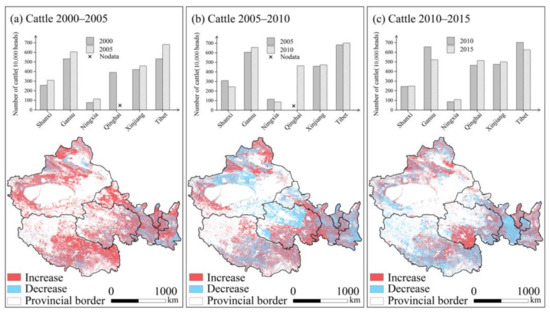 Spatiotemporal changes of cattle based on the DNN estimation. (a–c) represent 2000 to 2005, 2005 to 2010, and 2010 to 2015, respectively. The bar charts show the statistical value of cattle in each province.