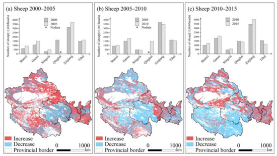 Figure 9 shows the characteristics of the spatiotemporal change of sheep from 2000 to 2015 at five-year intervals. Overall, the distribution of sheep shows a trend of increasing first, then decreasing, and it tends to stabilize finally in the study area. From 2000 to 2005, the number of sheep shows an increasing trend in most areas of the study area. However, the distribution of sheep in Qinghai Province has decreased significantly. This phenomenon was mainly affected by the “Three Rivers Source Ecological Protection Project” in 2005. From 2005 to 2010, the distribution of sheep decreased in most areas, most notably in Xinjiang and Qinghai. After 2005, driven by the comparative benefits of the breeding industry and planting, the size of forest and fruit in Xinjiang has expanded rapidly. The planting area of crops and forage has been significantly reduced. Due to the shortage of forage in the agricultural area, the supply of forage for cattle and sheep cannot be guaranteed, and the breeding cost is increasing year after year. Therefore, there is a trend to reduce the breeding scale. The decrease of sheep in Qinghai Province can be attributed to the “Three Rivers Source Ecological Protection Project” implemented in 2005. From 2010 to 2015, China began to focus on the ecological protection of the Qinghai-Tibet Plateau. The “Plan for Ecological Construction and Environmental Protection of the Qinghai-Tibet Plateau” may be led to a significant decrease of sheep on the Qinghai-Tibet Plateau.