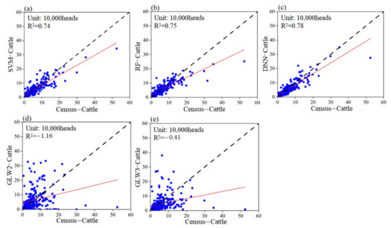 The scatter diagram of grided distribution density aggregated to the county scale and census data for cattle. (a) SVR; (b) RF; (c) DNN; (d) GLW2; and (e) GLW3. The red line is the linear regression line, and the dotted line is the 1:1 line.