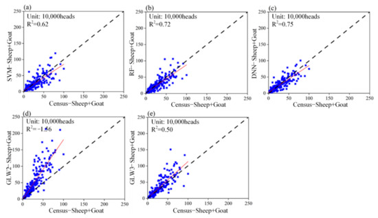 The scatter diagram of grided distribution density aggregated to the county scale and census data for sheep. (a) SVR; (b) RF; (c) DNN; (d) GLW2; and (e) GLW3. The red line is the linear regression line, and the dotted line is the 1:1 line.