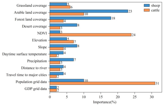 To explore the influence of selected environmental factors on the distribution of livestock, we have designed two parts of work: (1) correlation analysis of environmental factors and density of cattle and sheep (Figure 14); and (2) important analysis of each factor by random forest (Figure 15). It can be seen that when the significance level is less than 0.05, the selected factor has a specific correlation with the density of cattle and sheep and has the potential to predict the spatial distribution of livestock. There is a positive correlation between cattle density and population grid data, arable land coverage, and NDVI, and a negative correlation with desert coverage and the distance to the river. There is a positive correlation between sheep density and arable land coverage, daytime surface temperature, population, and GDP grid data. In contrast, it has a significant negative correlation with forest land coverage and slope. This is because areas with high arable land coverage and NDVI provide abundant resources for livestock activities, while natural conditions in regions with high desert coverage, forest coverage, and slopes are not suitable for livestock activities. The environmental factors that have a more significant impact on the spatial distribution of cattle are population grid data, NDVI, and arable land coverage. The environmental factors that have a more significant effect on the spatial distribution of sheep are arable land coverage, forest land coverage, and population grid data. It can be seen that population density and arable land coverage are the most critical environmental factors affecting the distribution of livestock density. The result is reasonable since the livestock is mostly dense around human activity areas, which is the difference between livestock and wild animals.
