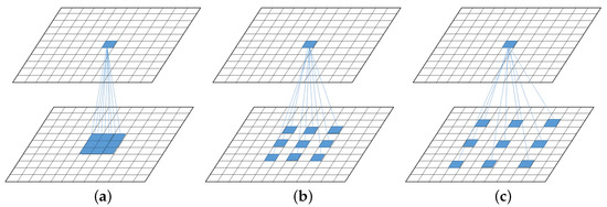 Receptive fields of dilated convolution at different dilation rates. (a) . (b) . (c) .