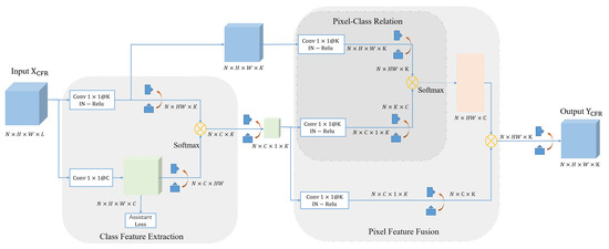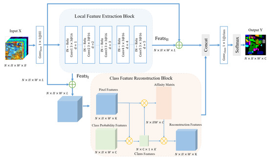 The most intuitive way to obtain the class representation in HSI is to take the average of all pixel features of the current category as the class center. In actual classification, the labels of all pixels is not available in advance. To this end, we employ a coarse classification mechanism to classify by the intermediate features and obtain the class probability of each pixel in a supervised manner. Through the weighted average of the pixel features and the corresponding class probability, the approximate class center is obtained as the class representation. Let the input of CFFB be , where L is the number of input channels. The class probabilities of pixels on the spatial position is calculated as follows: