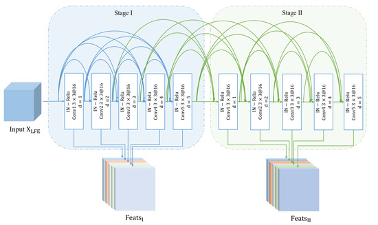 As the backbone of CFF-FCN, LFEB is a two-stage network based on dilated convolutions with dense connections and reverse loop mechanism. The stacking of dilated convolutions with different dilation rates fully considers the local information of different scales. Dense connections ensure the maximum information transmission in the network [31]. Let be the input of LFEB, which contains five dilated convolutions with convolution kernels of . The specific architecture is displayed in Figure 4. To ensure the continuity of local information while avoiding gridding effect, we employ a set of incremental dilation rates that set as . The nonlinear transformation of each convolutional layer is composed of instance normalization (IN) [32], rectified linear unit (ReLU) and convolution (Conv).