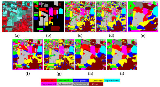 For Indian Pines image. (a) RGB composite image of three bands. (b) Ground-truth map. (c) 3DCNN. (d) CDCNN. (e) DFFN. (f) SSRN. (g) SSFCN-CRF. (h) TSFCN. (i) CFF-FCN.