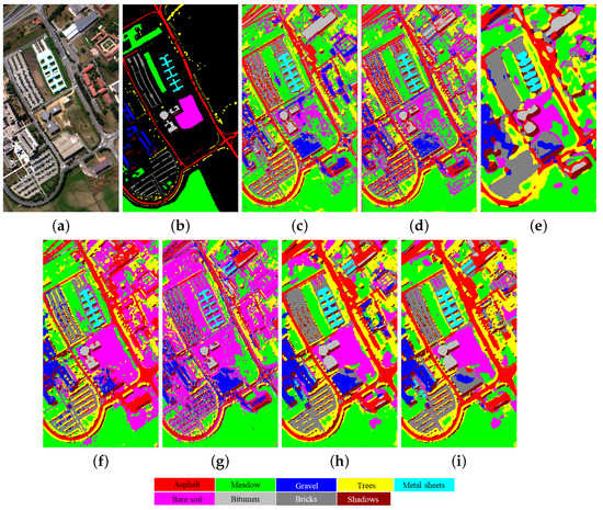 The UP data set was collected by the Reflective Optics System Imaging Spectrometer (ROSIS) from the University of Pavia, Italy. It contains 115 bands in the wavelength range of 0.43–0.86 μm, with a spatial resolution of m. Moreover, 12 bands were eliminated due to the influence of noise. The size of UP was , covering 9 classes, including trees, asphalt roads, bricks, pastures, etc.