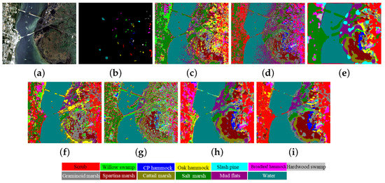 For Kennedy Space Center image. (a) RGB composite image of three bands. (b) Ground-truth map. (c) 3DCNN. (d) CDCNN. (e) DFFN. (f) SSRN. (g) SSFCN-CRF. (h) TSFCN. (i) CFF-FCN.
