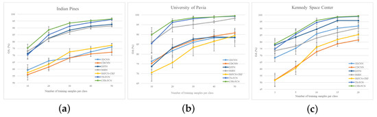 The overall accuracy (OA) of different methods for different numbers of training samples in three HSI data sets. (a) Indian Pines. (b) University of Pavia. (c) Kennedy Space Center.