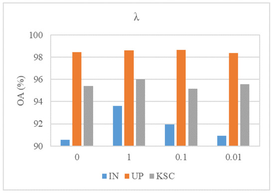 is the weighting factor used to balance the final classification loss and the coarse classification loss in Equation (21). To study the influence of on the classification performance of CFF-FCN, we conducted experiments with different values of on three data sets, and the results are reported in Figure 10. It can be seen that CFF-FCN on the IP data set is most sensitive to changes in . For IP and KSC data sets, the model performances are best when is 1. The UP data set is the least sensitive to changes in , and OA changes very little under different . Combining the classification results of the three data sets, we set to 1.