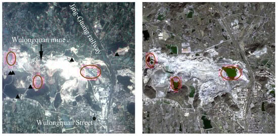 Figure 3 shows a comparison of a sub-area from the two images. The red ellipses indicate the places with large changes. From Figure 3, we can see that the open-pit mining was growing rapidly.