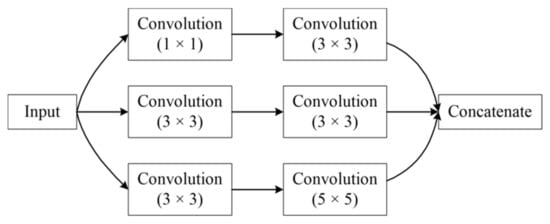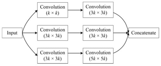 To fully utilize the contextual information, two different strategies were pursued for DEM and other data. The branches of the true color and the false color data were designed with fixed convolutional kernels. As shown in Figure 7, the kernel sizes were always 1 × 1 + 3 × 3, 3 × 3 + 3 × 3, and 3 × 3 + 5 × 5. The branch of the DEM data was designed with varied kernels to match the input size. As shown in Figure 8, the kernel sizes of DEM data were k × k + 3k × 3k, 3k × 3k + 3k × 3k, and 3k × 3k + 5k × 5k. Hence, the parameter k could be objectively selected using training and validation sets.